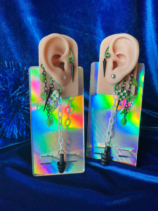 Ear Plug Ear Cuff Set - Green Checker Heart