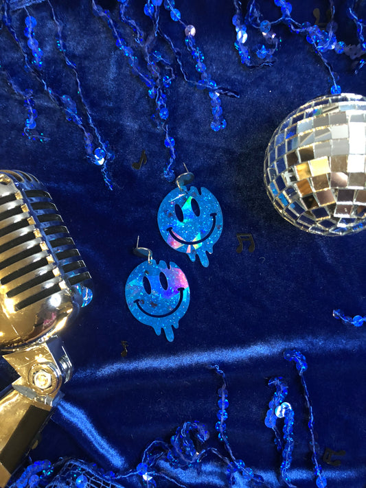 Blue Holographic Drippy Smiley Face Earrings