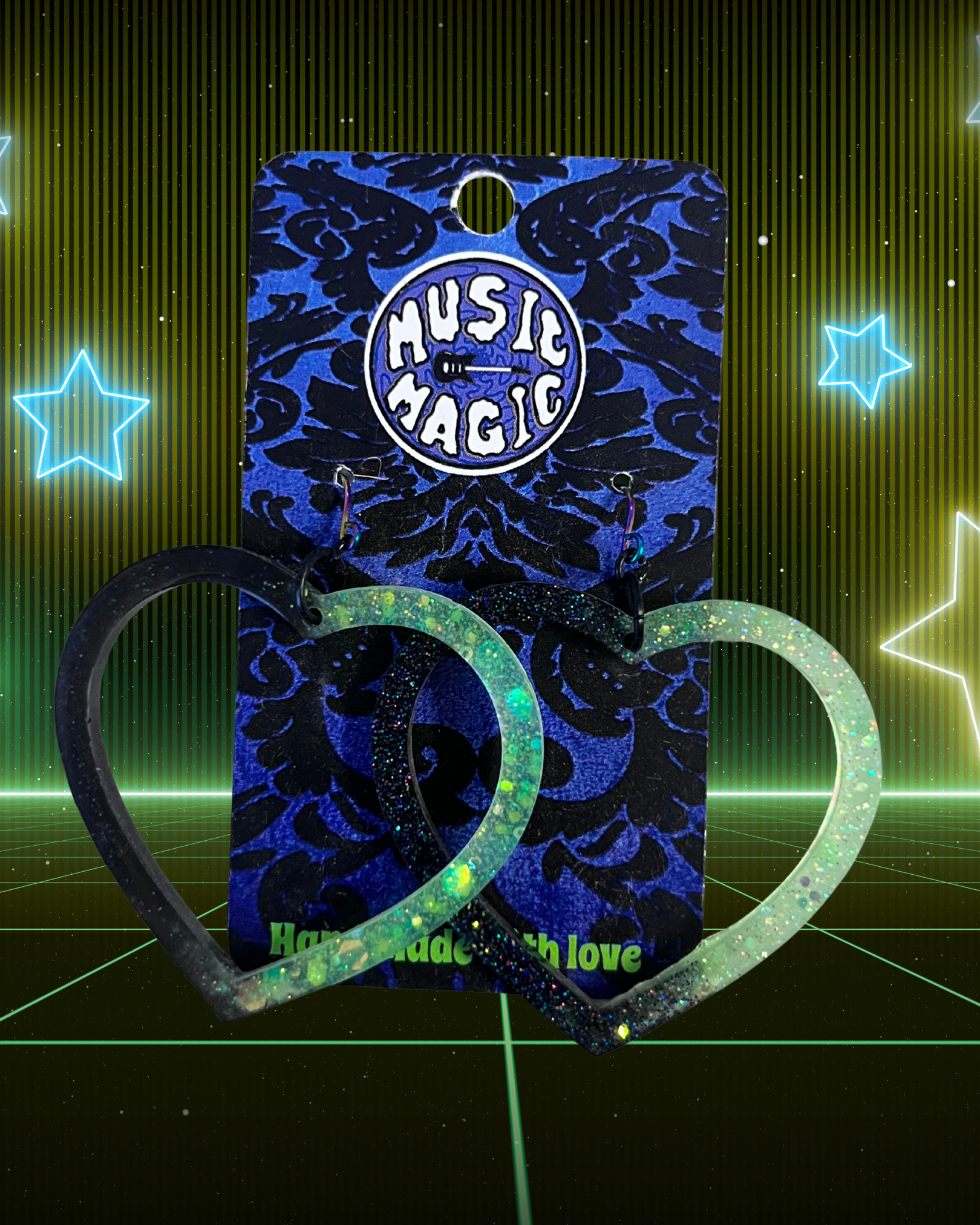 Just some cute heart outline earrings made with very lightweight resin and glitter! The blue/clear ones GLOW!